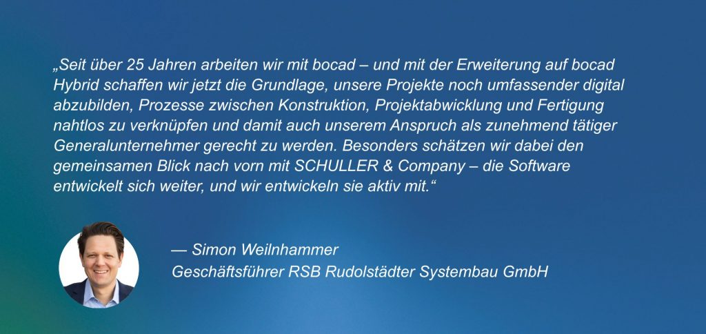 „Seit über 25 Jahren arbeiten wir mit bocad. Mit der Erweiterung auf bocad Hybrid schaffen wir jetzt die Grundlage, unsere Projekte noch umfassender digital abzubilden und die Prozesse zwischen Konstruktion, Projektabwicklung und Fertigung besser zu verknüpfen. Damit werden wir auch unserem Anspruch als zunehmend tätiger Generalunternehmer gerecht“, sagt Simon Weilnhammer, Geschäftsführer der RSB Rudolstädter Systembau GmbH.