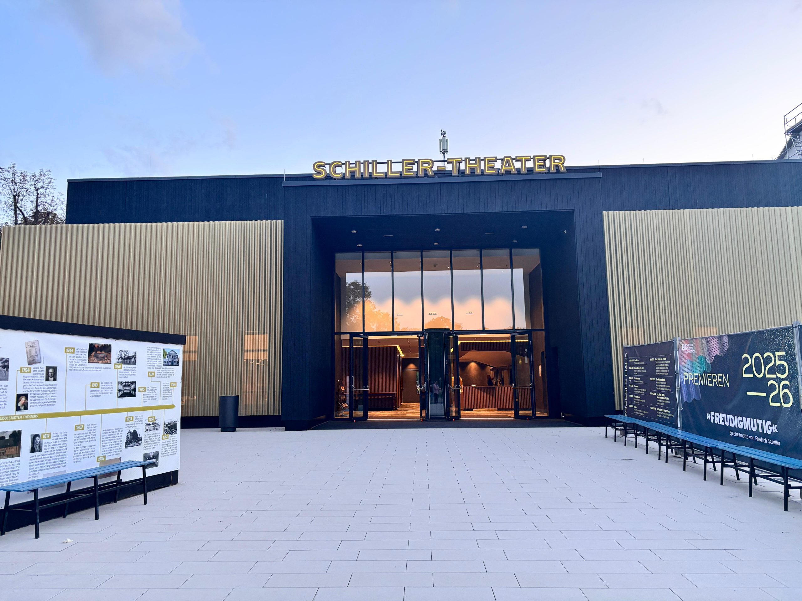 Das Schiller-Theater Rudolstadt wurde nach einer mehrjährigen Sanierungsphase als modernisiertes Zuschauerhaus am historischen Standort am Anger wiedereröffnet. Mit dem Umbau entstand ein Haus mit 275 Plätzen, einem barrierefreien Foyerbereich, einem fahrbaren Orchestergraben sowie zeitgemäßer Bühnen- und Veranstaltungstechnik. Im Rahmen der Baumaßnahmen leistete RSB die Fertigung und Montage von Fenster- und Türelementen sowie die Gestaltung der Außenfassade im Bereich des Haupteingangs. Ein besonderes Element ist die großformatige Glasfassade des neuen Foyers, die aus Montanstahl gefertigt wurde und großflächige Verglasungen aufnimmt. Durch diese Arbeiten wurde die Verbindung von moderner Architektur und historischer Bausubstanz baulich umgesetzt. Das Theater ist damit sowohl ein funktionaler Veranstaltungsort als auch ein prägender Bestandteil des städtebaulichen Umfelds von Rudolstadt.