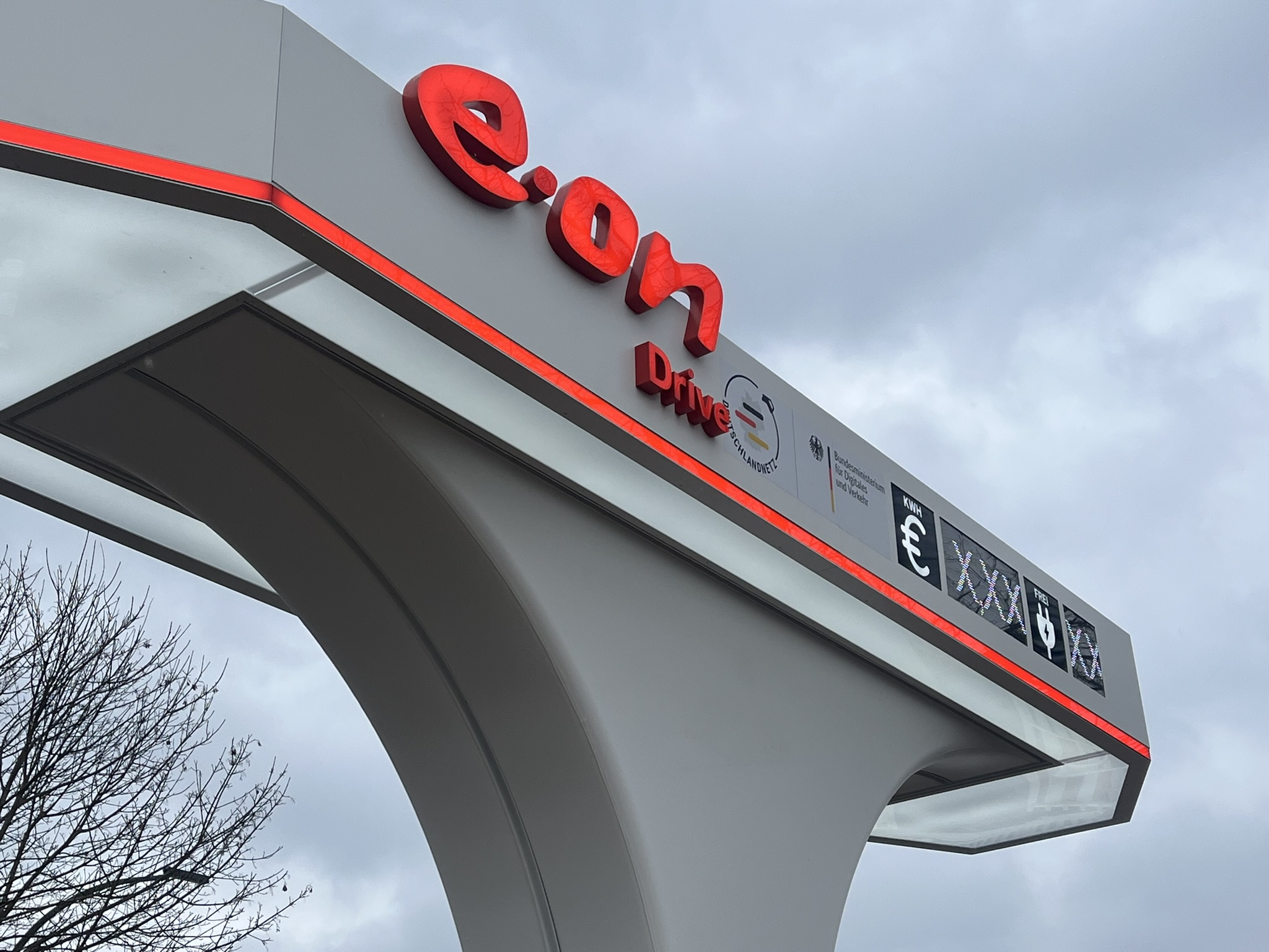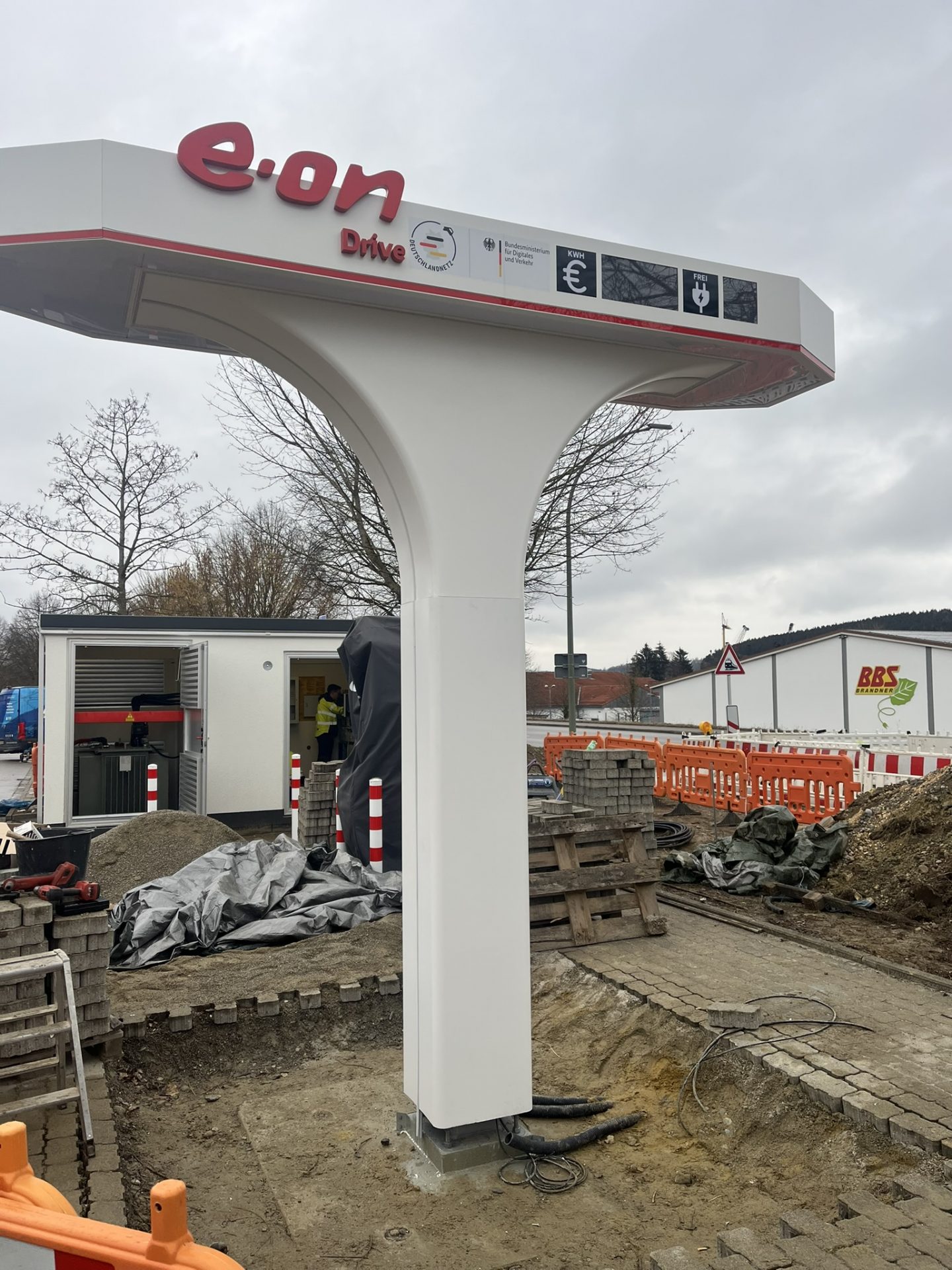 Nach erfolgreicher Entwicklungsphase begann nun der Betrieb. Gemeinsam mit E.ON plante RSB die T-Pole, zukünftig der markante Orientierungspunkt in den Ladeparks von E.ON. Die T-Konstruktion – hier bei der RSB Montage vor Ort in Krumbach – bildet mit einer Höhe von knapp vier Metern einen markanten Fixpunkt für die Ladeinfrastruktur der Zukunft. E.ON Drive setzt die T-Pole in kleinen und mittleren Ladeparks ein. Neben dem KWh-Preis wird auch die Verfügbarkeit der Ladepunkte angezeigt. Krumbach ist der erste Standort im Rahmen des Deutschlandnetzes. Vier Schnellladesäulen werden jeweils bis zu 400 kW zur Verfügung stellen.